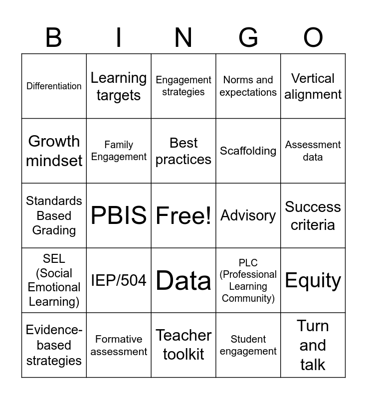 This bingo card has a free space and 26 words: Data, Student engagement, Best practices, Formative assessment, Vertical alignment, Differentiation, Growth mindset, Learning targets, Success criteria, PLC (Professional Learning Community), Scaffolding, Standards Based Grading, Equity, Evidence-based strategies, PBIS, “Piggybacking off that…”, Norms and expectations, SEL (Social Emotional Learning), Engagement strategies, Turn and talk, Assessment data, Teacher toolkit, Advisory, IEP/504, Family Engagement and BDOT Days.