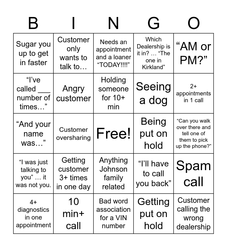 This bingo card has a free space and 24 words: Getting customer 3+ times in one day, 10 min+ call, Holding someone for 10+ min, 4+ diagnostics in one appointment, “AM or PM?”, Sugar you up to get in faster, “I’ve called ___ number of times…”, Customer only wants to talk to…, Being put on hold, Anything Johnson family related, Seeing a dog, “And your name was…”, “I’ll have to call you back”, Spam call, Angry customer, Getting put on hold, “Can you walk over there and tell one of them to pick up the phone?”, Needs an appointment and a loaner “TODAY!!!!”, 2+ appointments in 1 call, Customer oversharing, Customer calling the wrong dealership, “I was just talking to you” … it was not you., Which Dealership is it in? … “The one in Kirkland” and Bad word association for a VIN number.