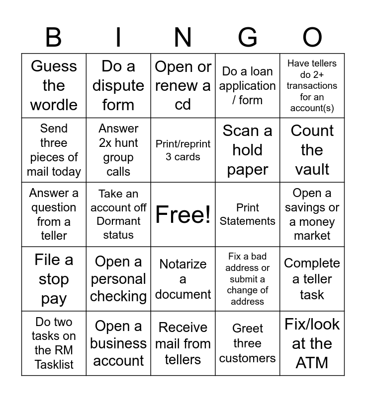 This bingo card has a free space and 24 words: Open a personal checking, Open a business account, Print/reprint 3 cards, Do two tasks on the RM Tasklist, Have tellers do 2+ transactions for an account(s), Guess the wordle, Send three pieces of mail today, Do a dispute form, Print Statements, Notarize a document, Scan a hold paper, Answer a question from a teller, Fix a bad address or submit a change of address, Complete a teller task, Answer 2x hunt group calls, Greet three customers, Open a savings or a money market, Open or renew a cd, Count the vault, Take an account off Dormant status, Fix/look at the ATM, File a stop pay, Do a loan application / form and Receive mail from tellers.