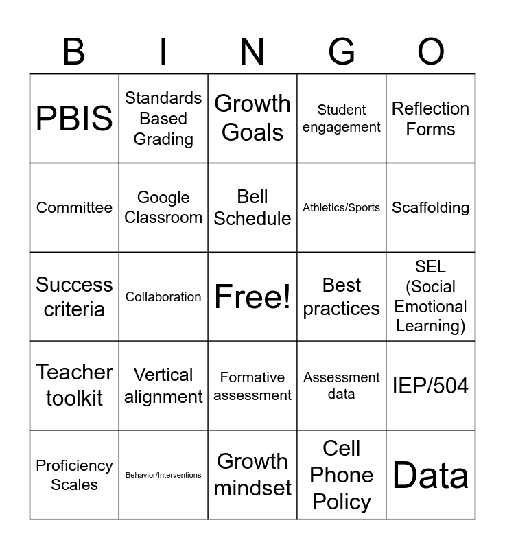 This bingo card has a free space and 45 words: Mastery Based Learning, Data, Backwards Planning, Proficiency Scales, Dress Code, Cell Phone Policy, Growth Goals, Discipline, Reflection Forms, Behavior/Interventions, Student engagement, Best practices, Formative assessment, Vertical alignment, Differentiation, Growth mindset, Learning targets, Success criteria, PLC (Professional Learning Community), Scaffolding, Standards Based Grading, Equity, Evidence-based strategies, PBIS, Norms and expectations, SEL (Social Emotional Learning), Engagement strategies, Turn and talk, Assessment data, Teacher toolkit, Advisory, IEP/504, Family Engagement, BDOT Days, Tier 1, Collaboration, Clarity, ELL, CTE, Bell Schedule, Committee, Athletics/Sports, After-School Activities, Google Classroom and Class Link.