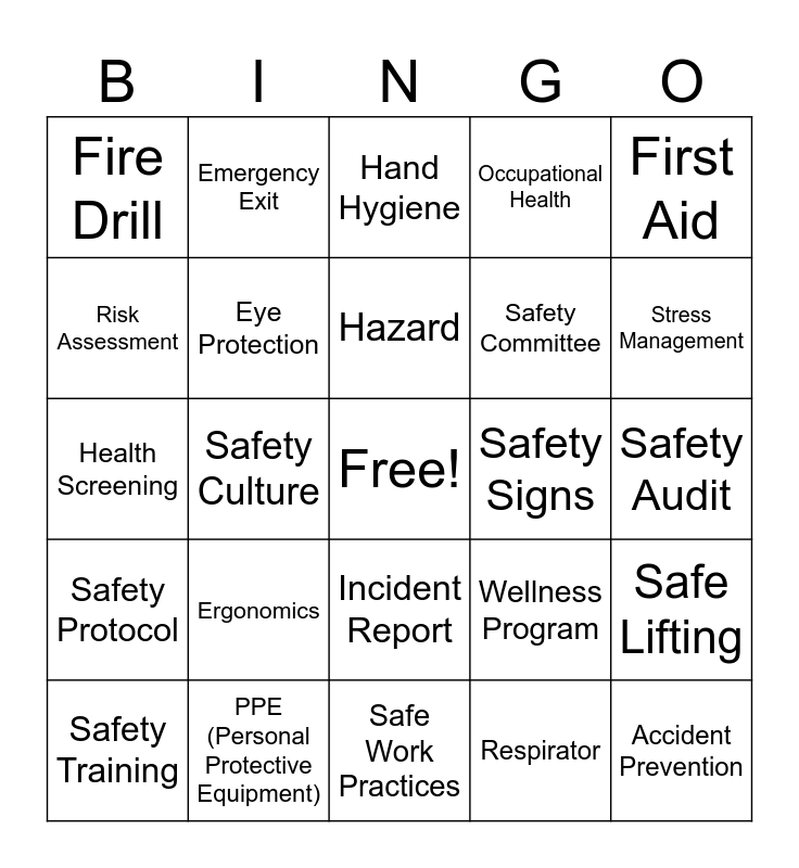 This bingo card has a free space and 24 words: Ergonomics, PPE (Personal Protective Equipment), Hazard, Safety Training, First Aid, Fire Drill, Risk Assessment, Emergency Exit, Safety Signs, Incident Report, Safety Committee, Health Screening, Wellness Program, Safe Lifting, Eye Protection, Respirator, Safety Audit, Hand Hygiene, Stress Management, Safety Culture, Accident Prevention, Safety Protocol, Occupational Health and Safe Work Practices.