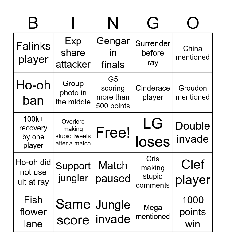 This bingo card has a free space and 51 words: Win0, 1000 points win, Venu player, Jungle invade, Support jungler, No ray fight, Exp share attacker, Your main picked, Ho-oh ban, Spinning/dancing, Group photo in the middle, Surrender before ray, Clef player, Cris making stupid comments, Screaming commentators, JP wins against NA, G5 scoring more than 500 points, LG loses, EU getting out of groups, China mentioned, Overlord making stupid tweets after a match, Mega mentioned, Falinks player, Cinderace player, Player jumped after the match, Player cried after the match, Groudon mentioned, Inder flopping, Fish flower lane, Gengar in finals, Snack tasting by commentators, Free hot dogs mentioned, Player wearing a hat, Your main plushie on screen, Winning by fewer than 5 points, Same score, Penta KOs, Exp share all-rounder, Slowbro ult wins ray, JP sableye banned, Double invade, Ho-oh did not use ult at ray, Team that got ray loses, 20+ KOs by one player, Level 7 before 8 minutes, 100k+ dmg by one player, 100k+ recovery by one player, Support MVP, New pokemon reveal, Match paused and Slash interviewed.