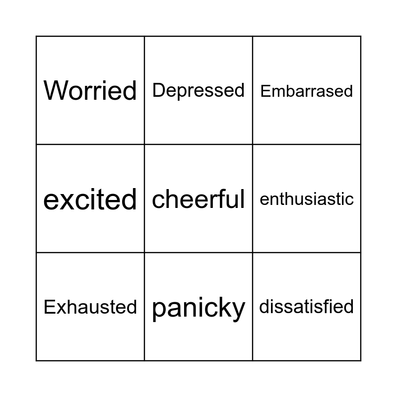 This bingo card has 31 words: Confident, Delighted, Determined, Dissapointed, Worried, Embarrased, Exhausted, Frustrated, Nervous, Proud, Relieved, Satisfied, Shocked, Stressed, Thrilled, Upset, Pleased, Amused, awkward, Bored, cheerful, confident, Curious, Depressed, dissatisfied, enthusiastic, excited, lonely, Social, panicky and Unsociable.