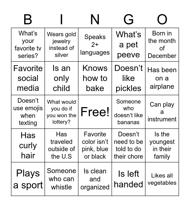 This bingo card has a free space and 29 words: Plays a sport, Has a pet that is not a dog or cat, What would you do if you won the lottery?, What do you like most about school?, What’s your favorite tv series?, Speaks 2+ languages, Is an only child, Has traveled outside of the U.S, Someone who doesn’t like bananas, Someone who can whistle, Can play a instrument, Likes all vegetables, Is clean and organized, Is left handed, Has been on a airplane, Your favorite animal can be found in a zoo, Favorite color isn’t pink, blue or black, Has curly hair, Born in the month of December, Doesn’t use emojis when texting, Doesn’t need to be told to do their chore, Likes spicy food, Doesn’t like pickles, Favorite social media, What’s a pet peeve, Wears gold jewelry instead of silver, Is the youngest in their family, Knows how to bake and Favorite holiday is Christmas.