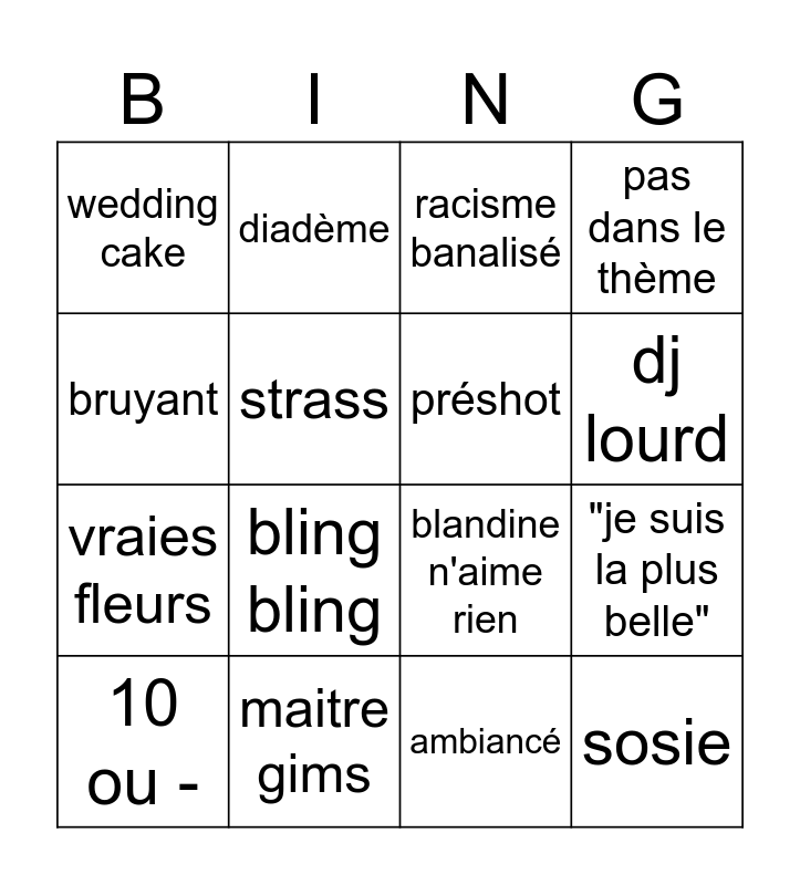 This bingo card has 16 words: maitre gims, "je suis la plus belle", racisme banalisé, wedding cake, vraies fleurs, diadème, blandine n'aime rien, ambiancé, bruyant, strass, 10 ou -, pas dans le thème, bling bling, dj lourd, préshot and sosie.