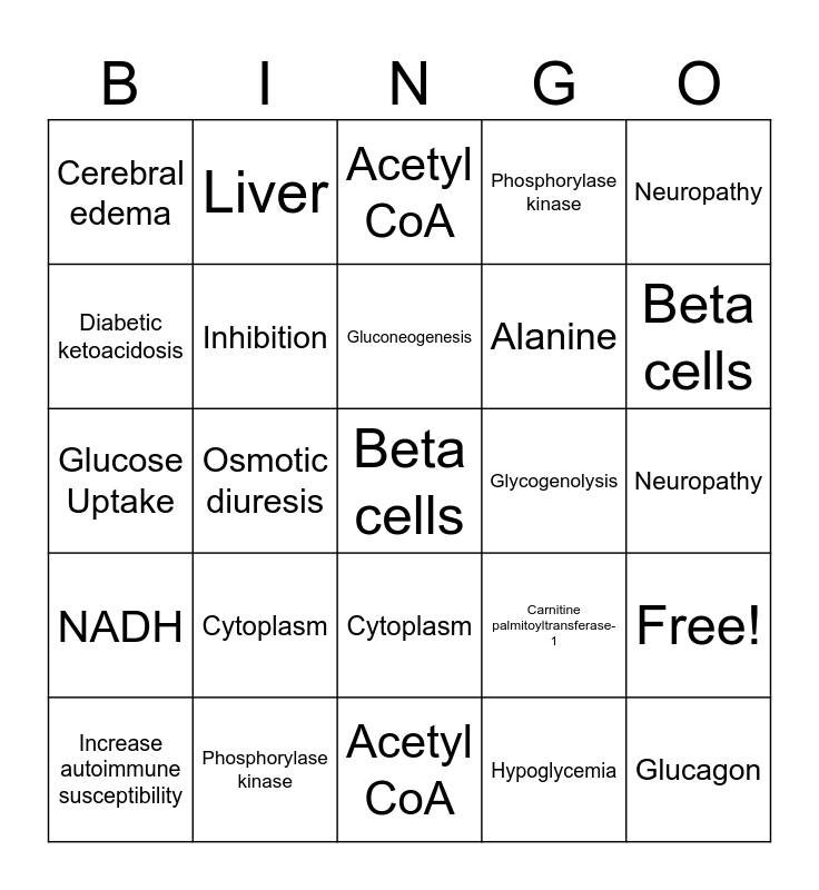 This bingo card has 50 words: Glucagon, Beta cells, Acetone, Acetyl CoA, Cytoplasm, Alanine, Liver, Potassium, Diabetic ketoacidosis, Proliferative, Inhibition, Phosphorylase kinase, Free!, Carnitine palmitoyltransferase-1, Metabolic acidosis, F-2,6-BP, Gluconeogenesis, Glycogenolysis, Retinopathy, Neuropathy, Osmotic diuresis, Hypoglycemia, Cerebral edema, Alanine, Increase autoimmune susceptibility, Glucagon, Beta cells, Fruity, Acetyl CoA, Cytoplasm, Liver, Potassium, Proliferative, Inhibition, Phosphorylase kinase, Carnitine palmitoyltransferase-1, F-2,6-BP, Gluconeogenesis, Retinopathy, Neuropathy, Osmotic diuresis, Hypoglycemia, Cerebral edema, Alanine, Increase autoimmune susceptibility, Glucose Uptake, PEP carboxylase, Beta-oxidation, NADH and Ketoacidosis.