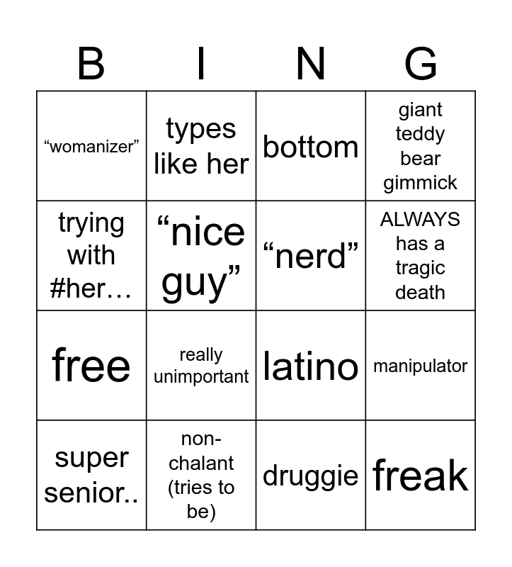 This bingo card has 16 words: super senior.., non-chalant (tries to be), bottom, giant teddy bear gimmick, trying with #her…, types like her, latino, manipulator, “womanizer”, “nice guy”, druggie, ALWAYS has a tragic death, free, really unimportant, “nerd” and freak.
