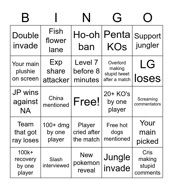 This bingo card has a free space and 24 words: 100+ dmg by one player, Slash interviewed, Level 7 before 8 minutes, 100k+ recovery by one player, Support jungler, Double invade, Your main plushie on screen, Fish flower lane, 20+ KO's by one player, Player cried after the match, Overlord making stupid tweet after a match, JP wins against NA, Free hot dogs mentioned, Your main picked, Exp share attacker, Jungle invade, Screaming commentators, Ho-oh ban, LG loses, China mentioned, Cris making stupid comments, Team that got ray loses, Penta KOs and New pokemon reveal.