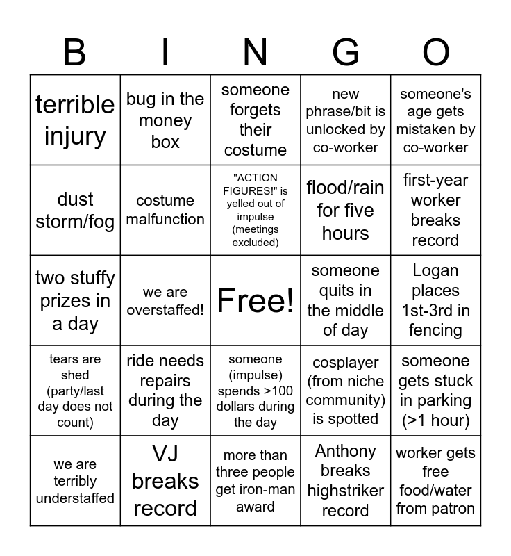 This bingo card has a free space and 36 words: patron compliments workers costume, more than two people forget their passes, someone breaks character in front of patron, costume malfunction, cosplayer (from niche community) is spotted, tears are shed (party/last day does not count), "ACTION FIGURES!" is yelled out of impulse (meetings excluded), someone complains about nicotine (not patron), someone's age gets mistaken by co-worker, more than five people in a car (clown car), we are overstaffed!, new phrase/bit is unlocked by co-worker, Anna gets called to office, someone quits in the middle of day, first-year worker breaks record, terrible injury, blueberry incident, ride needs repairs during the day, worker gets free food/water from patron, someone forgets their costume, Logan places 1st-3rd in fencing, someone gets stuck in parking (>1 hour), VJ breaks record, we are terribly understaffed, more than three people get iron-man award, bug in the money box, two stuffy prizes in a day, wasp incident, flood/rain for five hours, dust storm/fog, someone makes an excessive amount of tips, a little kid gets attached to Will, Anthony breaks highstriker record, someone (impulse) spends >100 dollars during the day, MVP award goes to breaker and someone's car breaks down.