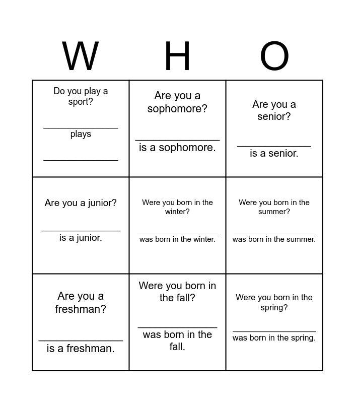 This bingo card has 9 words: Are you a freshman? ______________ is a freshman., Are you a senior? _____________ is a senior., Are you a sophomore? ______________ is a sophomore., Are you a junior? _______________ is a junior., Do you play a sport? _______________ plays _______________, Were you born in the summer? ___________________ was born in the summer., Were you born in the winter? ___________________ was born in the winter., Were you born in the spring? __________________ was born in the spring. and Were you born in the fall? ______________ was born in the fall..