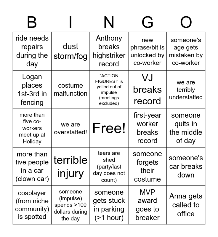 This bingo card has a free space and 39 words: patron compliments workers costume, more than two people forget their passes, someone breaks character in front of patron, costume malfunction, cosplayer (from niche community) is spotted, tears are shed (party/last day does not count), "ACTION FIGURES!" is yelled out of impulse (meetings excluded), someone complains about nicotine (not patron), someone's age gets mistaken by co-worker, more than five people in a car (clown car), we are overstaffed!, new phrase/bit is unlocked by co-worker, Anna gets called to office, someone quits in the middle of day, first-year worker breaks record, terrible injury, blueberry incident, ride needs repairs during the day, worker gets free food/water from patron, someone forgets their costume, Logan places 1st-3rd in fencing, someone gets stuck in parking (>1 hour), VJ breaks record, we are terribly understaffed, more than three people get iron-man award, bug in the money box, two stuffy prizes in a day, wasp incident, flood/rain for five hours, dust storm/fog, someone makes an excessive amount of tips, a little kid gets attached to Will, Anthony breaks highstriker record, someone (impulse) spends >100 dollars during the day, MVP award goes to breaker, Anna reprimands seasoned worker (of >3 years), someone's car breaks down, more than five co-workers meet up at Holiday and patron tries to haggle over price and/or prize.