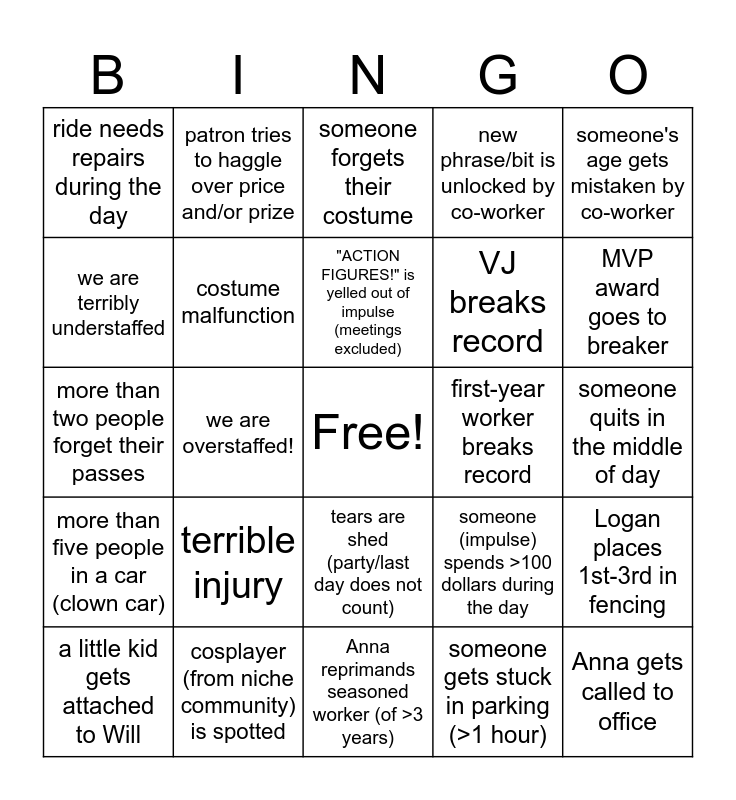 This bingo card has a free space and 40 words: patron compliments workers costume, more than two people forget their passes, someone breaks character in front of patron, costume malfunction, cosplayer (from niche community) is spotted, tears are shed (party/last day does not count), "ACTION FIGURES!" is yelled out of impulse (meetings excluded), someone complains about nicotine (not patron), someone's age gets mistaken by co-worker, more than five people in a car (clown car), we are overstaffed!, new phrase/bit is unlocked by co-worker, Anna gets called to office, someone quits in the middle of day, first-year worker breaks record, terrible injury, blueberry incident, ride needs repairs during the day, worker gets free food/water from patron, someone forgets their costume, Logan places 1st-3rd in fencing, someone gets stuck in parking (>1 hour), VJ breaks record, we are terribly understaffed, more than three people get iron-man award, bug in the money box, two stuffy prizes in a day, wasp incident, flood/rain for five hours, dust storm/fog, someone makes an excessive amount of tips, a little kid gets attached to Will, Anthony breaks highstriker record, someone (impulse) spends >100 dollars during the day, MVP award goes to breaker, Anna reprimands seasoned worker (of >3 years), someone's car breaks down, more than five co-workers meet up at Holiday, patron tries to haggle over price and/or prize and line from ride/game disrupts patron traffic.