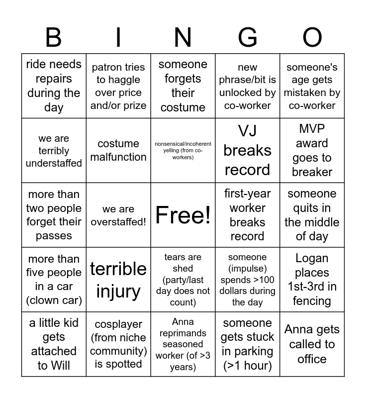 This bingo card has a free space and 40 words: patron compliments workers costume, more than two people forget their passes, someone breaks character in front of patron, costume malfunction, cosplayer (from niche community) is spotted, tears are shed (party/last day does not count), nonsensical/incoherent yelling (from co-workers), someone complains about nicotine (not patron), someone's age gets mistaken by co-worker, more than five people in a car (clown car), we are overstaffed!, new phrase/bit is unlocked by co-worker, Anna gets called to office, someone quits in the middle of day, first-year worker breaks record, terrible injury, blueberry incident, ride needs repairs during the day, worker gets free food/water from patron, someone forgets their costume, Logan places 1st-3rd in fencing, someone gets stuck in parking (>1 hour), VJ breaks record, we are terribly understaffed, more than three people get iron-man award, bug in the money box, two stuffy prizes in a day, wasp incident, flood/rain for five hours, dust storm/fog, someone makes an excessive amount of tips, a little kid gets attached to Will, Anthony breaks highstriker record, someone (impulse) spends >100 dollars during the day, MVP award goes to breaker, Anna reprimands seasoned worker (of >3 years), someone's car breaks down, more than five co-workers meet up at Holiday, patron tries to haggle over price and/or prize and line from a ride/game disrupts patron traffic.