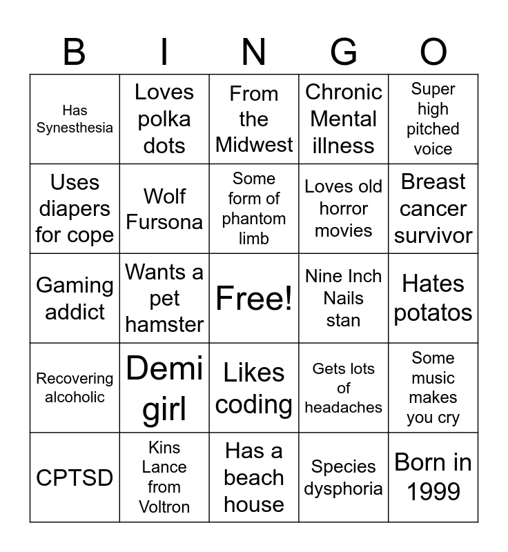 This bingo card has a free space and 24 words: CPTSD, Demi girl, Some form of phantom limb, Species dysphoria, Super high pitched voice, Has Synesthesia, Loves polka dots, From the Midwest, Nine Inch Nails stan, Hates potatos, Gaming addict, Wolf Fursona, Gets lots of headaches, Some music makes you cry, Uses diapers for cope, Kins Lance from Voltron, Has a beach house, Chronic Mental illness, Breast cancer survivor, Recovering alcoholic, Wants a pet hamster, Likes coding, Loves old horror movies and Born in 1999.
