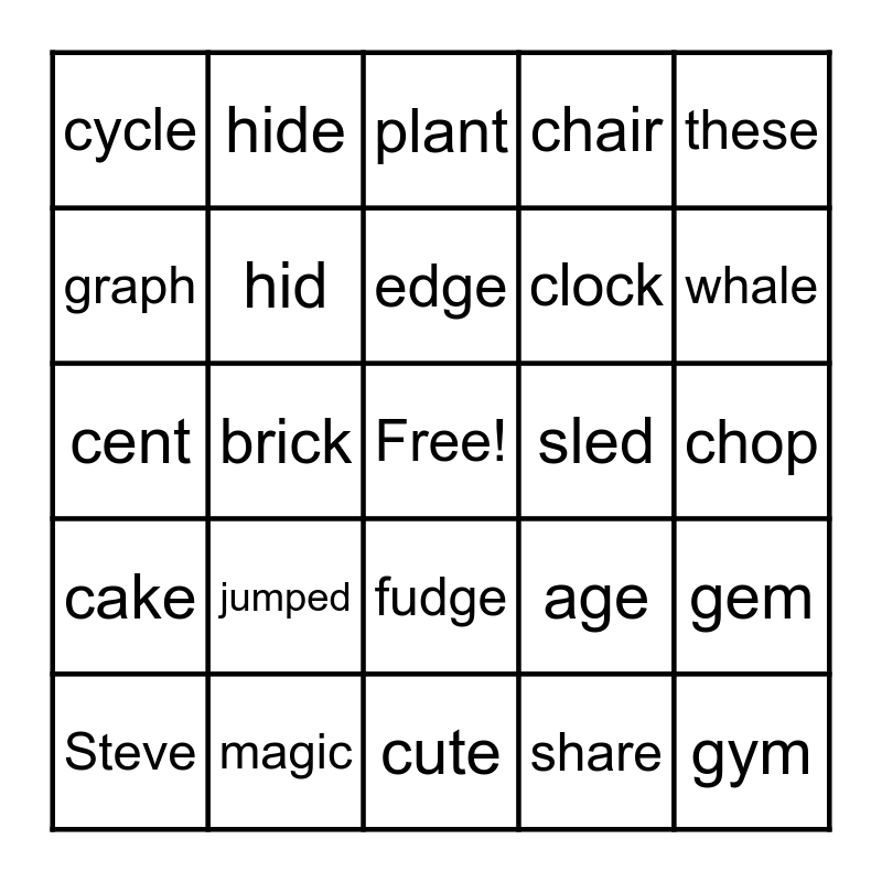 This bingo card has a free space and 24 words: jumped, magic, edge, Steve, these, cycle, graph, hide, sled, fudge, clock, cent, age, gem, hid, share, chop, plant, whale, brick, gym, cake, chair and cute.