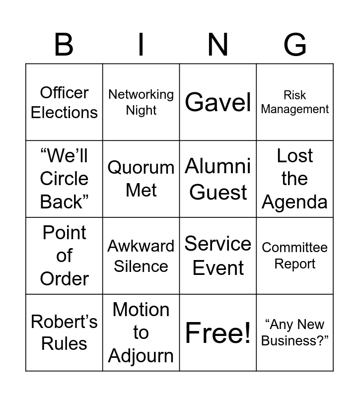 This bingo card has 17 words: Free!, Robert’s Rules, Gavel, Officer Elections, Awkward Silence, Risk Management, Committee Report, Alumni Guest, Lost the Agenda, Quorum Met, Motion to Adjourn, Service Event, “We’ll Circle Back”, Networking Night, Point of Order, Someone Brings Coffee and “Any New Business?”.