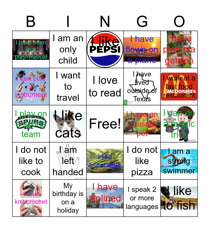 This bingo card has 17 images, a free space and 24 words: I am left handed, My birthday is on a holiday, I love to read, I can knit/crochet, I have plants/a garden, I have been in a play/musical, I can play an instrument, I am an only child, I have an unusual pet, I like asparagus, I have lived outside of Texas, I play on a sports team, I do not like pizza, I am a strong swimmer, I want to travel, I speak 2 or more languages, I can do a magic trick, I like, I work at a fast food restaurant, I like cats, I like to fish, I do not like to cook, I have flown on a plane and I have ziplined.