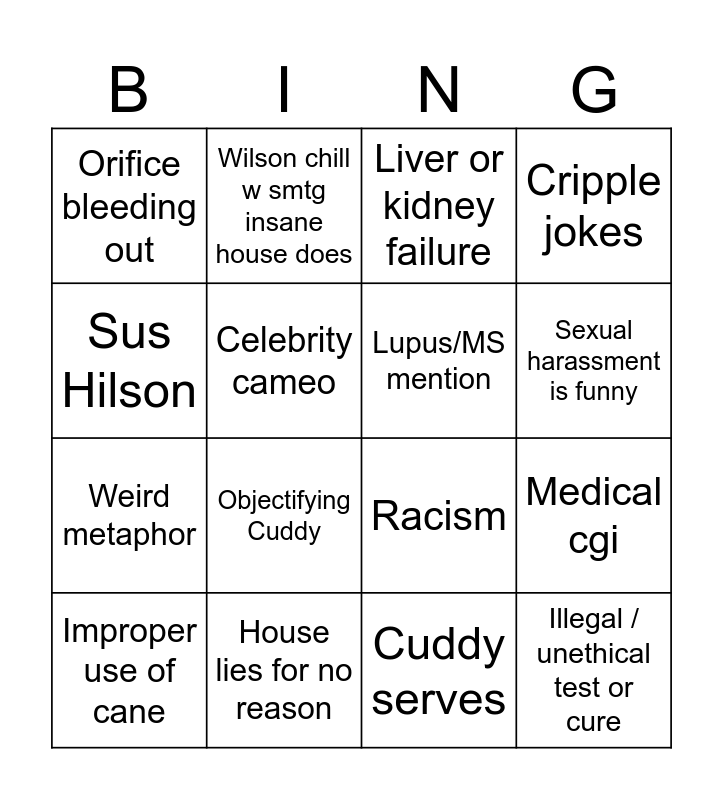 This bingo card has 40 words: LP, Racism, House eureka moment, Lupus/MS mention, B&E, Unnecessary pageing, Sexual harassment is funny, Seizure, Sus Hilson, Illegal / unethical test or cure, Medical cgi, Cripple jokes, Improper use of cane, Cuddy serves, House lies for no reason, Elevator block, "Its an infection", Orifice bleeding out, "Wanna bet", Liver or kidney failure, Dr Chase, Vicodin pop, Weird metaphor, Celebrity cameo, Crashing a surgery, Fakeout opening, House does smtg autistic, Clinic duty, Patient cant breathe, Skull drilling/ brain cutting, Medical cgi, Patient loses hearing /vision, House watching tv instead of working, House says smtg gay, Objectifying Cuddy, OOC House (nice), Tox screen, Haha 13 lesbian, Wilson chill w smtg insane house does and Wilson psycho analyzes House.