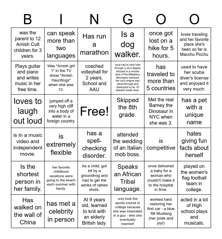 This bingo card has 36 words: Speaks an African Tribal language., As a child, got bit by a groundhog and had to get the series of rabies shots., only took the sports course in college because she was interested in a guy - who she eventually married!, Plays guitar and piano and writes music in her free time., is in a music video and independent movie., Skipped the 8th grade., Was "Amish girl 1" in the TV show "Amish Hauntings" when she was 12., At 9 years old, learned to knit with an elderly British lady., once got lost on a hike for 5 hours., once delivered a baby for a woman who couldn't make it to the hospital in time., used to have her scuba diver's license and enjoyed it very much., Is a dog walker., played on the women's flag football team in college., jumped off a very high cliff into a body of water in a foreign country., once had to hitch hike through a zero-degree blizzard in a remote area of the Allegheny Mountains because her car's engine was sliced through and destroyed by an 18 wheeler break shoe., was the parent to 12 Amish Cult children for 3 years., Is the shortest person in her family., Met the real Barney the Dinosaur in NYC when she was 3., loves to laugh out loud, Has run a marathon, Free!, is extremely flexible, attended the wedding of an Italian mob boss., has a spell-checking disorder., is competitive, can speak more than two languages, has traveled to more than 5 countries, has met a celebrity in person, coached volleyball for 2 years. School and AAU, loves traveling and her favorite place she's been so far is Macchu Picchu, acted in a lot of High school plays and musicals., Has walked on the wall of China, hates giving fun facts about herself, has a pet with a unique name, her favorite childhood vacations were going to the beach each summer with family. and worked hard restoring her first car - a blue '66 Mustang (her pride and joy!).