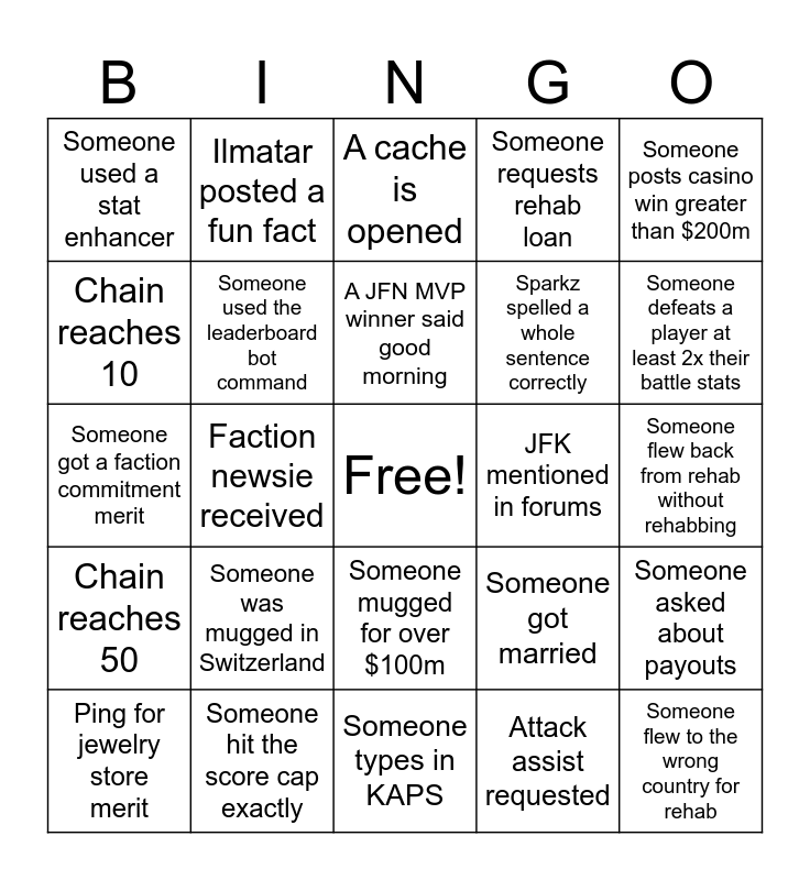 This bingo card has a free space and 38 words: Someone overdosed, Recruitment post bumped, Someone attacked a fellow faction member, Someone used the leaderboard bot command, Someone asked about payouts, Someone was mugged in Switzerland, A JFN MVP winner said good morning, Someone posts casino loss greater than $200m, Someone posts casino win greater than $200m, Sparkz spelled a whole sentence correctly, Faction newsie received, Someone requests rehab loan, Someone flew to the wrong country for rehab, Someone flew back from rehab without rehabbing, Chain reaches 10, Chain reaches 50, Chain reaches 100, A cache is opened, Someone found a stat enhancer in the city, JFK mentioned in forums, Someone used a stat enhancer, Someone hit the score cap exactly, Someone defeats a player at least 2x their battle stats, Ping for jewelry store merit, Someone got the jewellery store merit, Someone types in KAPS, Z joined voice chat, JFK emoji used, Someone asks how to play Bingo, Weapon price check request in #guru, @JFK Members ping, Someone mugged for over $100m, Attack assist requested, Ilmatar posted a fun fact, Someone hit 100 skill in a crime, Someone got married, Someone got a faction commitment merit and A JFK faction has 40+ online members.