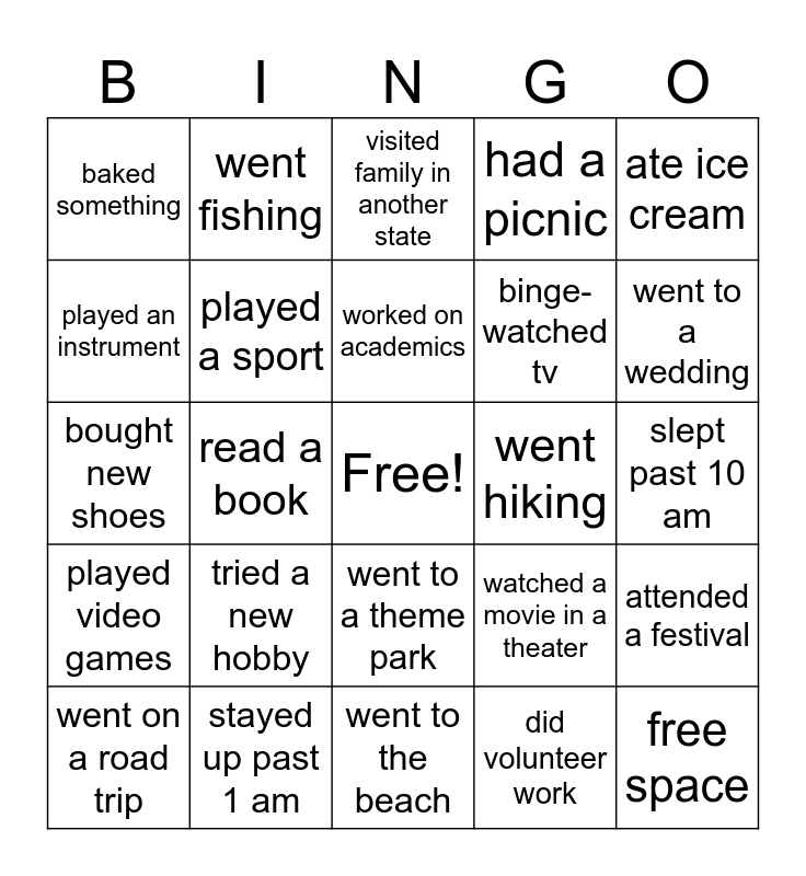 This bingo card has a free space and 31 words: went to the beach, tried a new food, read a book, went to a concert, baked something, visited family in another state, played a sport, watched a movie in a theater, went hiking, did volunteer work, slept past 10 am, free space, went swimming, went camping, went to a wedding, got a haircut, attended a festival, tried a new hobby, played video games, went to a theme park, ate ice cream, saw fireworks, went on a road trip, went fishing, binge-watched tv, played an instrument, had a picnic, bought new shoes, stayed up past 1 am, worked on academics and went to camp.