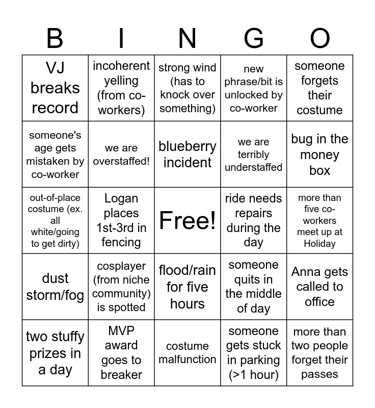 This bingo card has a free space and 48 words: patron compliments workers costume, more than two people forget their passes, someone breaks character in front of patron, costume malfunction, cosplayer (from niche community) is spotted, tears are shed (party/last day does not count), incoherent yelling (from co-workers), someone complains about nicotine (not patron), someone's age gets mistaken by co-worker, more than five people in a car (clown car), we are overstaffed!, new phrase/bit is unlocked by co-worker, Anna gets called to office, someone quits in the middle of day, first-year worker breaks record, terrible injury, blueberry incident, ride needs repairs during the day, worker gets free food/water from patron, someone forgets their costume, Logan places 1st-3rd in fencing, someone gets stuck in parking (>1 hour), VJ breaks record, we are terribly understaffed, more than three people get iron-man award, bug in the money box, two stuffy prizes in a day, wasp incident, flood/rain for five hours, dust storm/fog, someone makes an excessive amount of tips, a little kid gets attached to Will, Anthony breaks highstriker record, someone (impulse) spends >100 dollars during the day, MVP award goes to breaker, Anna reprimands seasoned worker (of >3 years), someone's car breaks down, more than five co-workers meet up at Holiday, patron tries to haggle over price and/or prize, line from a ride/game disrupts patron traffic, breaker runs out of money for change, honse breaks record, strong wind (has to knock over something), patron requests "the manager" at game, out-of-place costume (ex. all white/going to get dirty), patrons do group photos in front of booth, security is seen escorting someone and patron wanders into employee-only area.