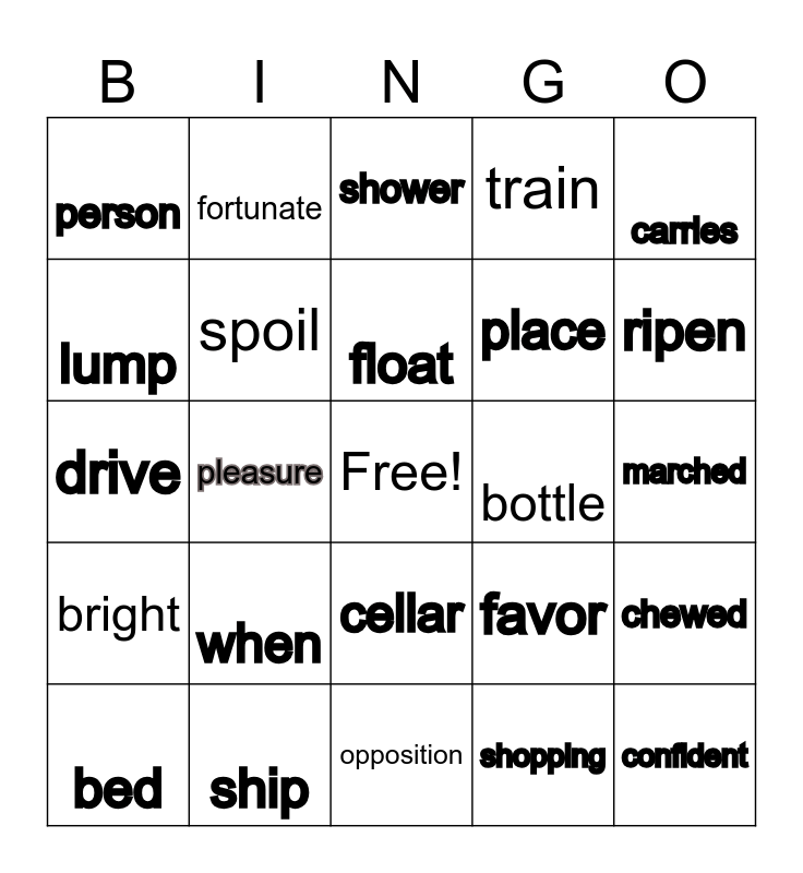This bingo card has a free space and 24 words: when, ship, float, bed, carries, person, lump, fortunate, bottle, cellar, place, drive, favor, chewed, spoil, shopping, marched, shower, ripen, pleasure, confident, bright, train and opposition.