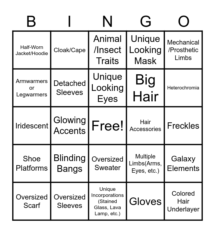 This bingo card has a free space and 24 words: Blinding Bangs, Oversized Sleeves, Unique Looking Eyes, Oversized Scarf, Mechanical /Prosthetic Limbs, Half-Worn Jacket/Hoodie, Armwarmers or Legwarmers, Cloak/Cape, Hair Accessories, Oversized Sweater, Big Hair, Iridescent, Multiple Limbs(Arms, Eyes, etc.), Galaxy Elements, Detached Sleeves, Gloves, Freckles, Animal /Insect Traits, Heterochromia, Glowing Accents, Colored Hair Underlayer, Shoe Platforms, Unique Looking Mask and Unique Incorporations (Stained Glass, Lava Lamp, etc.).
