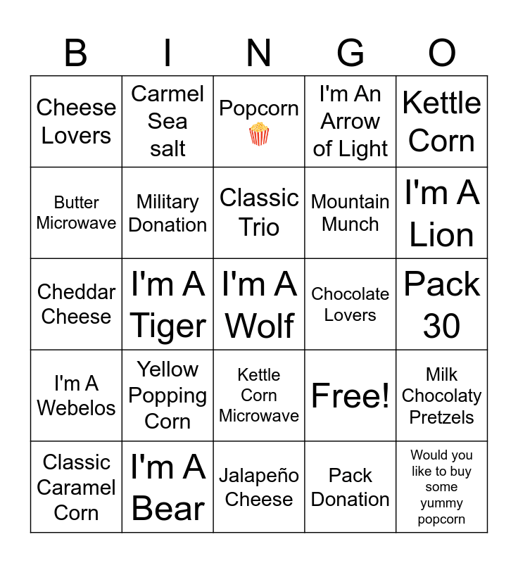This bingo card has 25 words: Yellow Popping Corn, Jalapeño Cheese, Classic Trio, Classic Caramel Corn, Kettle Corn, Cheese Lovers, Butter Microwave, Carmel Sea salt, Chocolate Lovers, Kettle Corn Microwave, Mountain Munch, Cheddar Cheese, Free!, Milk Chocolaty Pretzels, Military Donation, Would you like to buy some yummy popcorn, Pack 30, Popcorn 🍿, I'm A Lion, I'm A Tiger, I'm A Wolf, I'm A Bear, I'm A Webelos, I'm An Arrow of Light and Pack Donation.