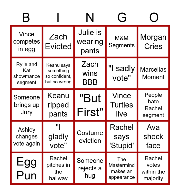 This bingo card has a free space and 64 words: Keanu CLEARLY throws Block Buster, Julie says "What were you thinking?", Mickey dodo montage, Ava shock face, Tie is broken, Keanu Evicted, Zach Evicted, Keanu wins BBB, Zach wins BBB, Vince wins BBB, Costume eviction, Goodbye segments, People hate Rachel segment, Morgan Cries, Lauren DR (Vote doesn't count), Rylie and Kat showmance segment, Keanu ripped pants, Vince competes in egg, Julie gets complimented, "I sadly vote", "I gladly vote", Ashley changes vote again, M&M Segments, Rachel campaigns post BBB, Keanu revealed as winner to silence, Someone cries in their speech, Evicted HG hugs Julie, Someone shouts out people for people on the block who can't shoutout, Zach Shirtless, Keanu Shrugs, Pigs in a blanket served during episode, Someone says God, Zach revealing his power segment, Vince begs to be saved in Egg Suit, Marcellas Moment, Egg Pun, New twist is teased, The Mastermind makes an appearance, Flashback segment, Keanu says something so confident, but so wrong, Someone brings up Jury, Vince Turtles live, Someone does something stupid, A man votes first, A man votes last, Rachel votes within the majority, Rachel pitches in the hallway, HoH comp tease is shown, Rachel says 'Stupid', Julie has to ask evictee to keep it movin, Ava being silly segment, Mickey talkin trash on her allies, Someone rejects a hug, Kelley DR, Keanu and Rachel segment, Someone throws ally under the bus, Julie is wearing pants, Tech issue, Ashley and Rachel vote differently, Ava sleeping segment, Someone gets censored for cursing on air, MONTAGE, Julie gets called a nickname and Lauren/Zach segment.