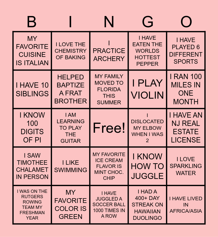 This bingo card has a free space and 24 words: I LIKE SWIMMING, MY FAVORITE COLOR IS GREEN, MY FAMILY MOVED TO FLORIDA THIS SUMMER, I WAS ON THE RUTGERS ROWING TEAM MY FRESHMAN YEAR, I HAVE PLAYED 6 DIFFERENT SPORTS, MY FAVORITE CUISINE IS ITALIAN, I HAVE 10 SIBLINGS, I LOVE THE CHEMISTRY OF BAKING, I DISLOCATED MY ELBOW WHEN I WAS 2, MY FAVORITE ICE CREAM FLAVOR IS MINT CHOC. CHIP, I PLAY VIOLIN, I KNOW 100 DIGITS OF PI, I KNOW HOW TO JUGGLE, I LOVE SPARKLING WATER, HELPED BAPTIZE A FRAT BROTHER, I HAD A 400+ DAY STREAK ON HAWAIIAN DUOLINGO, I HAVE AN NJ REAL ESTATE LICENSE, I PRACTICE ARCHERY, I RAN 100 MILES IN ONE MONTH, I AM LEARNING TO PLAY THE GUITAR, I HAVE LIVED IN AFRICA/ASIA, I SAW TIMOTHEE CHALAMET IN PERSON, I HAVE EATEN THE WORLDS HOTTEST PEPPER and I HAVE JUGGLED A SOCCER BALL 1000 TIMES IN A ROW.