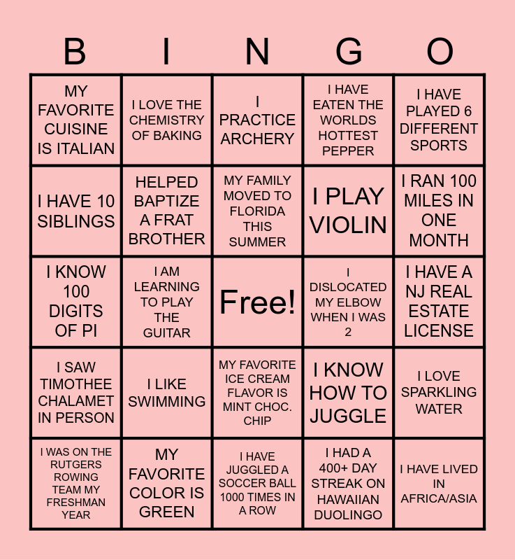 This bingo card has a free space and 24 words: I LIKE SWIMMING, MY FAVORITE COLOR IS GREEN, MY FAMILY MOVED TO FLORIDA THIS SUMMER, I WAS ON THE RUTGERS ROWING TEAM MY FRESHMAN YEAR, I HAVE PLAYED 6 DIFFERENT SPORTS, MY FAVORITE CUISINE IS ITALIAN, I HAVE 10 SIBLINGS, I LOVE THE CHEMISTRY OF BAKING, I DISLOCATED MY ELBOW WHEN I WAS 2, MY FAVORITE ICE CREAM FLAVOR IS MINT CHOC. CHIP, I PLAY VIOLIN, I KNOW 100 DIGITS OF PI, I KNOW HOW TO JUGGLE, I LOVE SPARKLING WATER, HELPED BAPTIZE A FRAT BROTHER, I HAD A 400+ DAY STREAK ON HAWAIIAN DUOLINGO, I HAVE A NJ REAL ESTATE LICENSE, I PRACTICE ARCHERY, I RAN 100 MILES IN ONE MONTH, I AM LEARNING TO PLAY THE GUITAR, I HAVE LIVED IN AFRICA/ASIA, I SAW TIMOTHEE CHALAMET IN PERSON, I HAVE EATEN THE WORLDS HOTTEST PEPPER and I HAVE JUGGLED A SOCCER BALL 1000 TIMES IN A ROW.