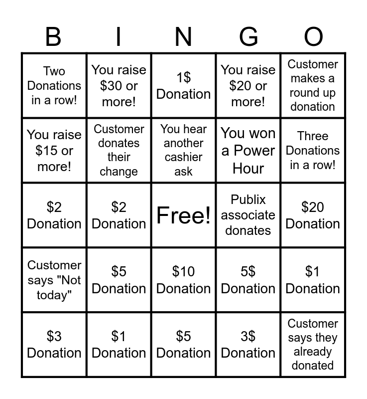 This bingo card has a free space and 24 words: $5 Donation, $1 Donation, You hear another cashier ask, $3 Donation, Customer makes a round up donation, Two Donations in a row!, You raise $15 or more!, You raise $30 or more!, Publix associate donates, $10 Donation, You won a Power Hour, $2 Donation, 5$ Donation, $1 Donation, Customer donates their change, 3$ Donation, $20 Donation, 1$ Donation, Three Donations in a row!, $2 Donation, Customer says they already donated, Customer says "Not today", You raise $20 or more! and $5 Donation.