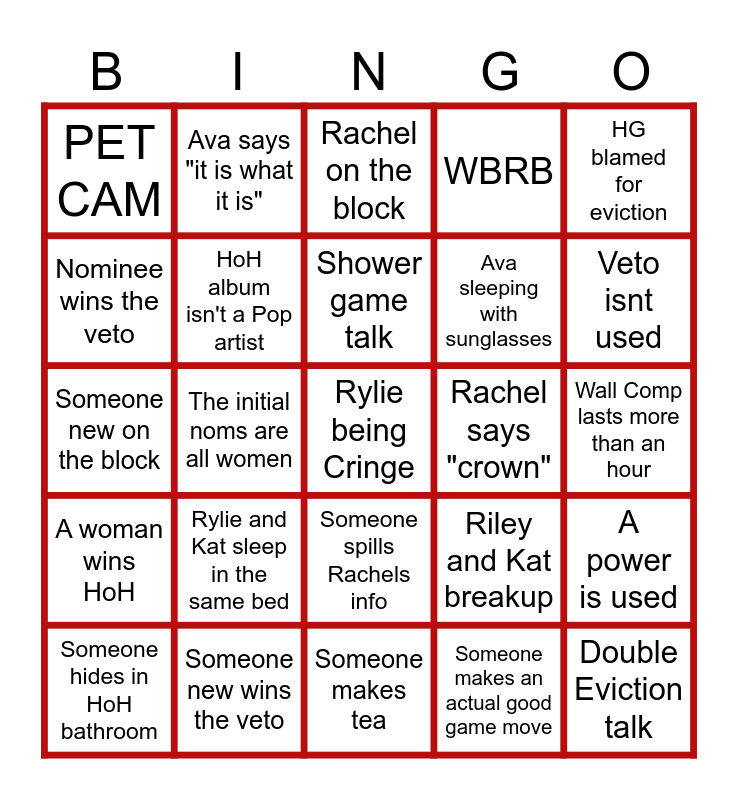 This bingo card has a free space and 69 words: Mickey Vs. Rachel fight, Wall Comp lasts more than an hour, Wall comp lasts less than an hour, Ava is on the block, Someone new wins the veto, Repeat HoH, WBRB, Morgan cries, HG blamed for eviction, Morgan falls off the wall first, A power is used, Feeds down >4 hours, PET CAM, Rachel on the block, Mickey acts like she is the HoH (or is the HoH), The initial noms are all women, Someone spills Rachels info, Ava sleeping with sunglasses, A man wins HoH, A woman wins HoH, Rachel says "crown", Riley and Kat breakup, Veto isnt used, Veto is used, Mickey nominated, Kelley is back on the block, Jury mention, Mickey and Morgan argue, Someone makes an actual good game move, Ants, Ava says "it is what it is", Rachel cleaning, Vinny and Rachel align, Keanu fully trusts Rachel, Taran posts about his frustration on Twitter/Bluesky, Cam switch at the worst possible time, Someone mentions meditating, People trying to figure out who voted who, Nominee wins the veto, M&Ms, Rylie and Kat sleep in the same bed, Double Eviction talk, Ashley overstays her welcome in a 1 on 1., Will doesn't simply agree with someone he is talking to, HoH music is classic Rock, Someone hides in HoH bathroom, Another "-gate" moment, Mickey or Morgan center themselves in a conversation, Nail Painting, HoH album isn't a Pop artist, Shower game talk, HoH noms their ally, Cams dont switch from pets to WBRB, Someone makes tea, A new alliance is formed, Burnt food, Mushroom coffee, Lauren 10 second pause mid sentence, Vince stays up past 5am BBT, Someone new on the block, Heavy Hitters mentioned, A fifth nominee touches the block, Kelley volunteers for the block, HoH one on ones before noms, Everyone knows about Zach's power, Zach doesn't use power, Veto thrown, Cam talk and Hammock talk.