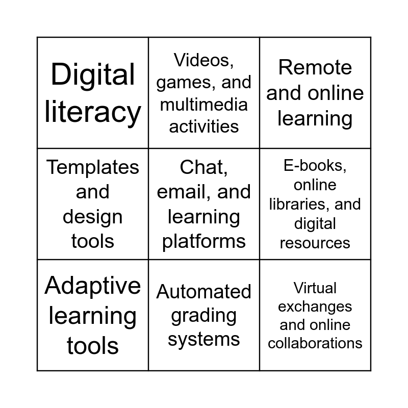 This bingo card has a free space and 8 words: E-books, online libraries, and digital resources, Remote and online learning, Videos, games, and multimedia activities, Adaptive learning tools, Digital literacy, Virtual exchanges and online collaborations, Templates and design tools and Automated grading systems.
