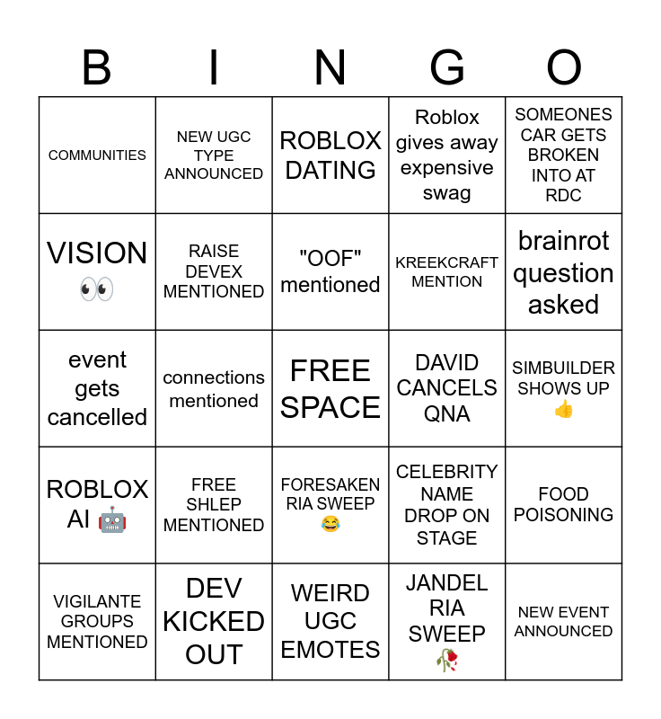 This bingo card has a free space and 24 words: FREE SHLEP MENTIONED, DEV KICKED OUT, "OOF" mentioned, VIGILANTE GROUPS MENTIONED, SOMEONES CAR GETS BROKEN INTO AT RDC, COMMUNITIES, VISION 👀, NEW UGC TYPE ANNOUNCED, DAVID CANCELS QNA, FORESAKEN RIA SWEEP 😂, KREEKCRAFT MENTION, event gets cancelled, CELEBRITY NAME DROP ON STAGE, FOOD POISONING, RAISE DEVEX MENTIONED, JANDEL RIA SWEEP 🥀, SIMBUILDER SHOWS UP 👍, ROBLOX DATING, brainrot question asked, connections mentioned, NEW EVENT ANNOUNCED, ROBLOX AI 🤖, Roblox gives away expensive swag and WEIRD UGC EMOTES.