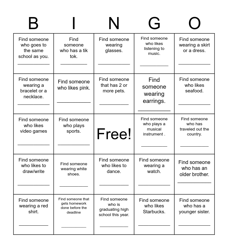 This bingo card has a free space and 24 words: Find someone wearing white shoes. ____________, Find someone that gets homework done before the deadline ____________, Find someone that has 2 or more pets. ___________, Find someone wearing a red shirt. ___________, Find someone wearing a skirt or a dress. ____________, Find someone who goes to the same school as you. ____________, Find someone wearing a bracelet or a necklace. ____________, Find someone who has a tik tok. __________, Find someone who plays a musical instrument . ___________, Find someone who likes to dance. ___________, Find someone wearing earrings. __________, Find someone who likes video games ____________, Find someone wearing a watch. ____________, Find someone who has an older brother. ____________, Find someone who likes pink. ____________, Find someone who likes Starbucks. ____________, Find someone who has traveled out the country. ____________, Find someone wearing glasses. ____________, Find someone who likes seafood. ____________, Find someone who plays sports. ____________, Find someone who has a younger sister. ____________, Find someone who likes to draw/write ____________, Find someone who likes listening to music. ____________ and Find someone who is graduating high school this year. ____________.