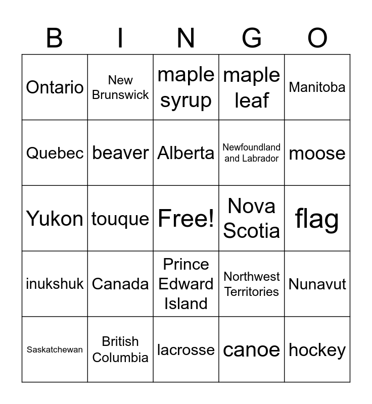 This bingo card has a free space and 24 words: Canada, British Columbia, Alberta, Saskatchewan, Manitoba, Ontario, Quebec, New Brunswick, Nova Scotia, Prince Edward Island, Newfoundland and Labrador, Yukon, Northwest Territories, Nunavut, beaver, canoe, flag, maple syrup, moose, touque, hockey, inukshuk, maple leaf and lacrosse.