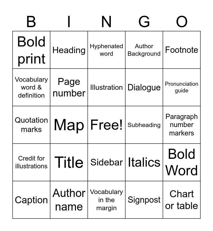 This bingo card has a free space and 24 words: Title, Author name, Illustration, Caption, Footnote, Bold print, Vocabulary word & definition, Heading, Subheading, Sidebar, Dialogue, Quotation marks, Italics, Bold Word, Page number, Signpost, Paragraph number markers, Hyphenated word, Pronunciation guide, Map, Chart or table, Credit for illustrations, Author Background and Vocabulary in the margin.