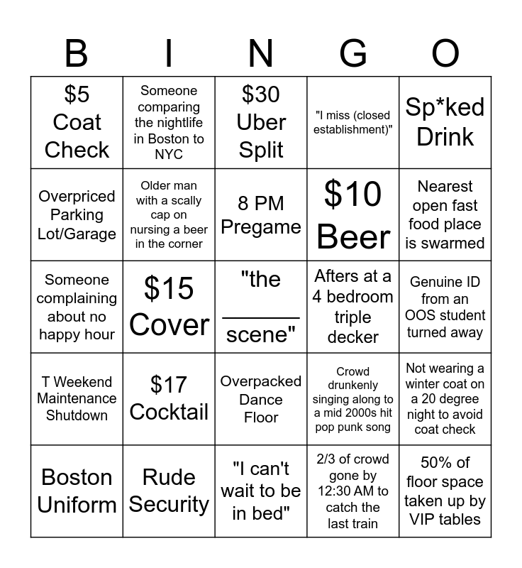 This bingo card has a free space and 24 words: Boston Uniform, $17 Cocktail, 8 PM Pregame, 2/3 of crowd gone by 12:30 AM to catch the last train, Sp*ked Drink, $5 Coat Check, Someone comparing the nightlife in Boston to NYC, $30 Uber Split, Afters at a 4 bedroom triple decker, Genuine ID from an OOS student turned away, Someone complaining about no happy hour, Older man with a scally cap on nursing a beer in the corner, Crowd drunkenly singing along to a mid 2000s hit pop punk song, Not wearing a winter coat on a 20 degree night to avoid coat check, Overpriced Parking Lot/Garage, Rude Security, "I can't wait to be in bed", "I miss (closed establishment)", Nearest open fast food place is swarmed, T Weekend Maintenance Shutdown, $15 Cover, Overpacked Dance Floor, $10 Beer and 50% of floor space taken up by VIP tables.