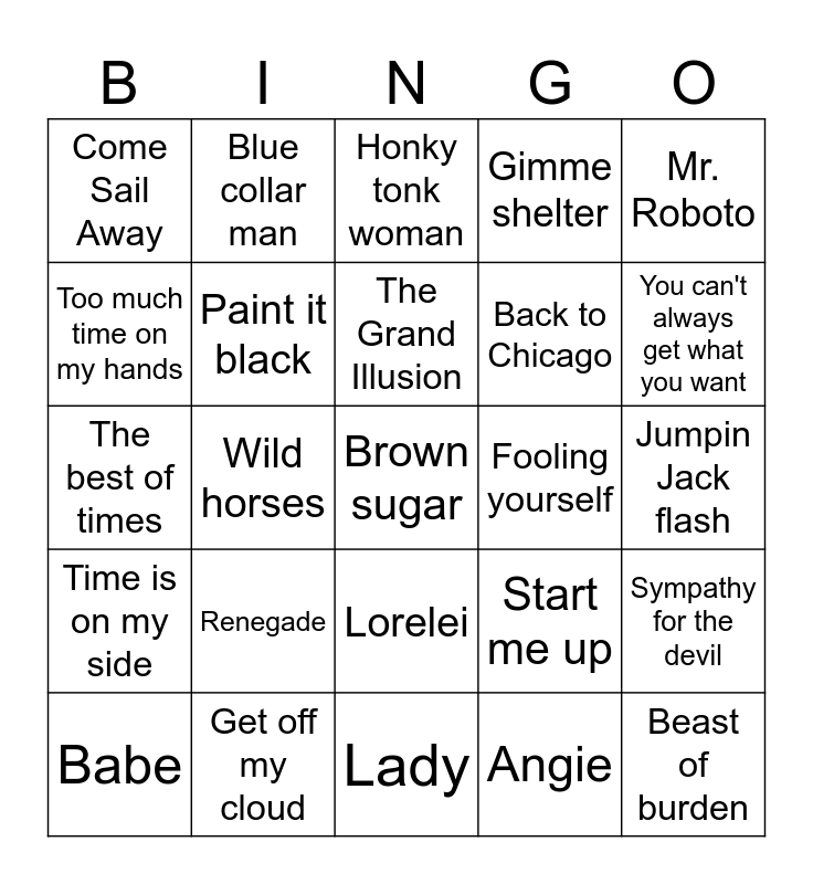 This bingo card has 25 words: Renegade, Lady, The Grand Illusion, Babe, Mr. Roboto, Come Sail Away, Too much time on my hands, Blue collar man, Fooling yourself, Lorelei, Back to Chicago, The best of times, Start me up, Sympathy for the devil, Paint it black, Beast of burden, Jumpin Jack flash, Honky tonk woman, You can't always get what you want, Wild horses, Brown sugar, Get off my cloud, Time is on my side, Gimme shelter and Angie.