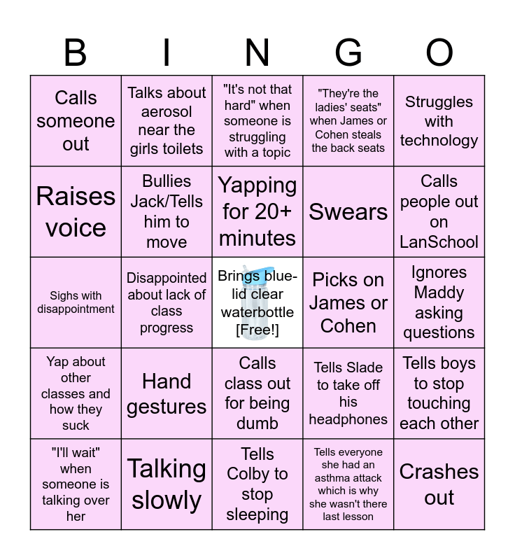 This bingo card has a free space and 24 words: Hand gestures, Talking slowly, Yapping for 20+ minutes, "I'll wait" when someone is talking over her, Struggles with technology, Calls someone out, Raises voice, Talks about aerosol near the girls toilets, Picks on James or Cohen, Calls class out for being dumb, Swears, Sighs with disappointment, Tells Slade to take off his headphones, Tells boys to stop touching each other, Bullies Jack/Tells him to move, Tells everyone she had an asthma attack which is why she wasn't there last lesson, Ignores Maddy asking questions, "It's not that hard" when someone is struggling with a topic, Calls people out on LanSchool, Disappointed about lack of class progress, Crashes out, Yap about other classes and how they suck, "They're the ladies' seats" when James or Cohen steals the back seats and Tells Colby to stop sleeping.