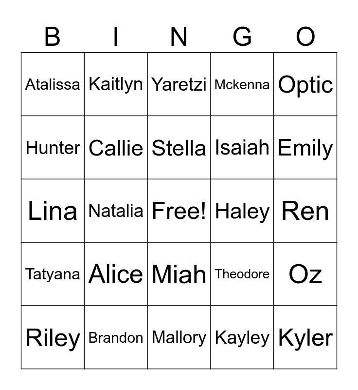 This bingo card has a free space and 26 words: Miah, Kayley, Stella, Brandon, Optic, Atalissa, Hunter, Kaitlyn, Ren, Theodore, Isaiah, Lina, Oz, Riley, Natalia, Estella, Mckenna, Tatyana, Yaretzi, Kyler, Emily, Mallory, Haley, Alice, Callie and Theodore.