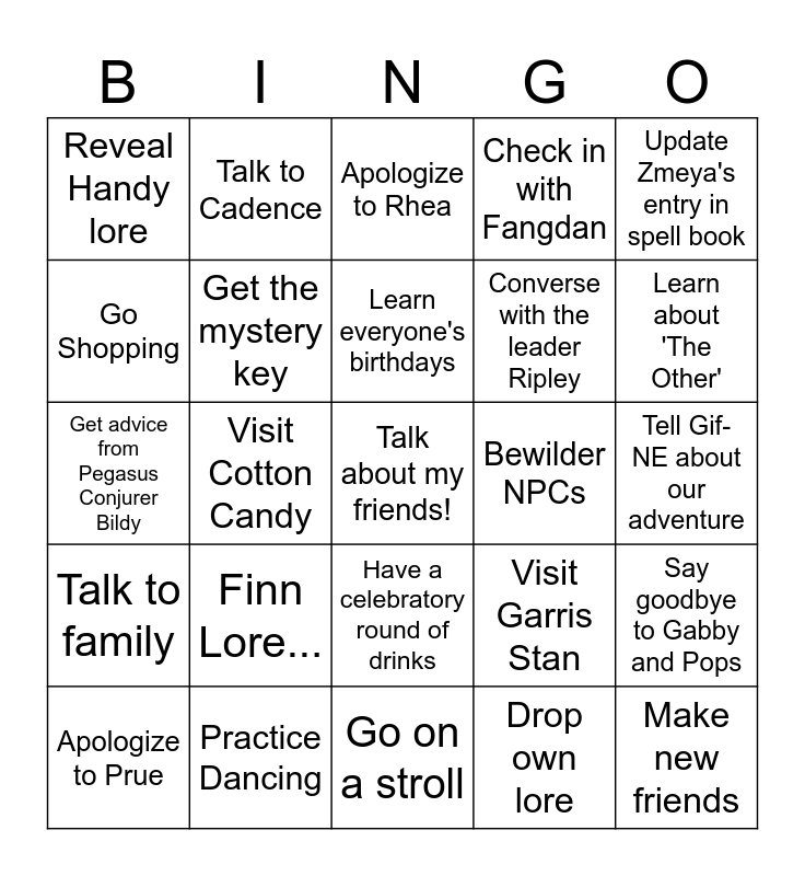 This bingo card has a free space and 24 words: Finn Lore..., Practice Dancing, Learn everyone's birthdays, Apologize to Prue, Update Zmeya's entry in spell book, Reveal Handy lore, Go Shopping, Talk to Cadence, Bewilder NPCs, Have a celebratory round of drinks, Converse with the leader Ripley, Get advice from Pegasus Conjurer Bildy, Visit Garris Stan, Say goodbye to Gabby and Pops, Get the mystery key, Drop own lore, Tell Gif-NE about our adventure, Apologize to Rhea, Learn about 'The Other', Visit Cotton Candy, Make new friends, Talk to family, Check in with Fangdan and Go on a stroll.