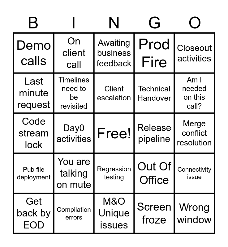 This bingo card has a free space and 53 words: Can you hear me?, Wrong window, Machine acting up, Screen froze, You are talking on mute, Be right back, On client call, Dropping off for another call, Last minute request, Dev plan, Timelines need to be revisited, Code revamp, Connectivity issue, Out Of Office, Need to step away, Get back by EOD, Client escalation, Release pipeline, Trackwise updates, Closeout activities, Day0 activities, DB package review, Technical Handover, Demo calls, Build failures, Compilation errors, GitHub support, CQ is down, Joining in 5 mins, Am I needed on this call?, You are free to drop, Resource planning, Design walkthrough, Prod deployment, UAT cannot be impacted, Unable to login, Prod Fire, M&O Unique issues, Awaiting business feedback, Use case updates, Not infront of my machine, Meeting conflicts, Merge conflict resolution, Modified files review, Mock deployment, Regression testing, CAB approval, Artifacts submission, Code stream lock, Pub file deployment, Rules deployment, Migration and Environment refresh.