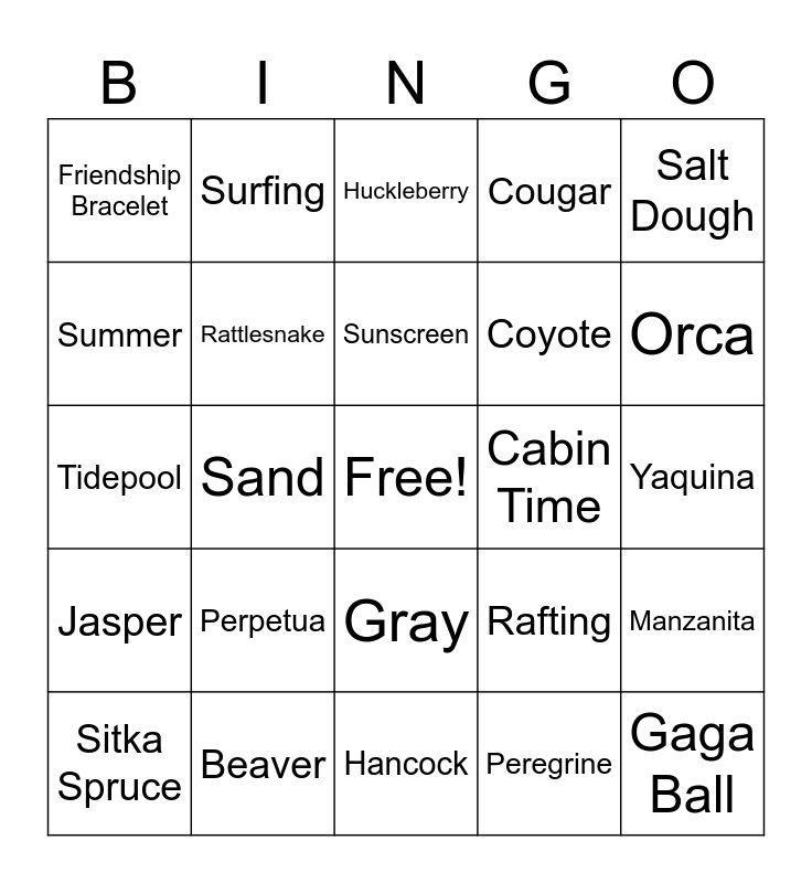 This bingo card has a free space and 60 words: Owl, Beaver, Boar’s Nest, Jasper, Peregrine, Pronghorn, Rattlesnake, Scorpion, Coyote, Kestrel, Cougar, Rosehip, Summer, Bus, Campfire, Friendship Bracelet, Gaga Ball, Salt Dough, Chalk, Sunscreen, Cabin Time, Huckleberry, Sitka Spruce, Manzanita, Squirrel, Frog, Banana Slug, Sea Otter, Orca, Sea Lion, Crab, Jellyfish, Shark, Backpacking, Surfing, Canoe, Beach, Sand, Aquarium, Tidepool, Whale, Perpetua, Yaquina, Sleep Under the Stars, Rafting, Telescope, John Day, Desert, Forest, Gray, Hancock, Newport, Fossil, Sweet and Green, 218, Take Me Home, Sea Legs, Broom Sweepa Broom, Golden Dust Pan, Chuckwagon and RESPECT.