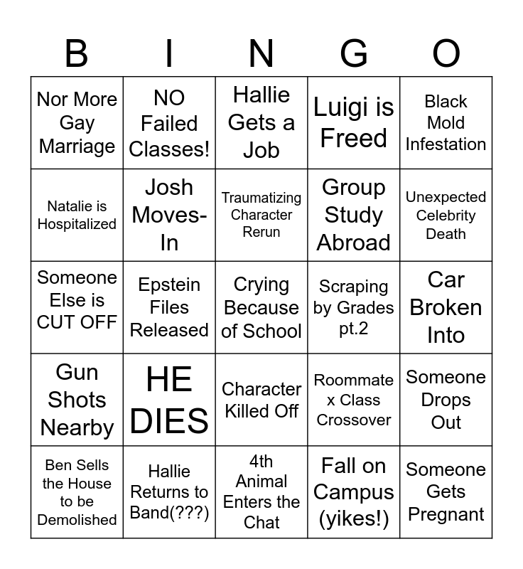 This bingo card has a free space and 24 words: HE DIES, Hallie Returns to Band(???), Traumatizing Character Rerun, Ben Sells the House to be Demolished, Black Mold Infestation, Nor More Gay Marriage, Natalie is Hospitalized, NO Failed Classes!, Scraping by Grades pt.2, Character Killed Off, Group Study Abroad, Someone Else is CUT OFF, Roommate x Class Crossover, Someone Drops Out, Josh Moves-In, Fall on Campus (yikes!), Car Broken Into, Hallie Gets a Job, Unexpected Celebrity Death, Epstein Files Released, Someone Gets Pregnant, Gun Shots Nearby, Luigi is Freed and 4th Animal Enters the Chat.