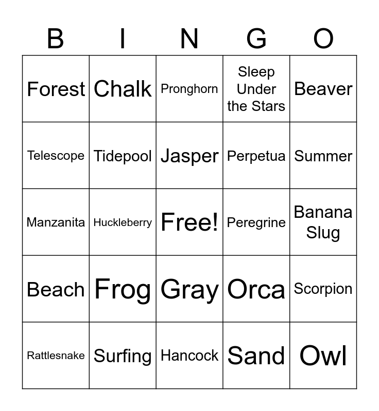 This bingo card has a free space and 60 words: Backpacking, Surfing, Canoe, Beach, Sand, Aquarium, Tidepool, Whale, Perpetua, Yaquina, Sleep Under the Stars, Rafting, Telescope, John Day, Desert, Forest, Owl, Beaver, Boar’s Nest, Jasper, Peregrine, Pronghorn, Rattlesnake, Scorpion, Coyote, Kestrel, Cougar, Rosehip, Summer, Bus, Campfire, Friendship Bracelet, Gaga Ball, Salt Dough, Chalk, Sunscreen, Cabin Time, Huckleberry, Sitka Spruce, Manzanita, Squirrel, Frog, Banana Slug, Sea Otter, Orca, Sea Lion, Crab, Jellyfish, Shark, Gray, Hancock, Newport, Fossil, Sweet and Green, 218, Take Me Home, Sea Legs, Broom Sweepa Broom, Golden Dust Pan, Chuckwagon and RESPECT.