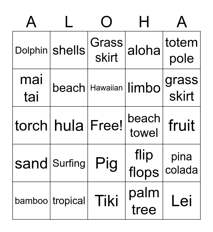 This bingo card has a free space and 29 words: bamboo, Luau, Tiki, palm tree, totem pole, mai tai, shells, coconut, beach towel, Lei, torch, beach, roast, flip flops, fruit, Pineapple, hula, Pig, aloha, pina colada, sand, tropical, Hawaiian, limbo, grass skirt, Dolphin, Surfing, Grass skirt and moomoo.
