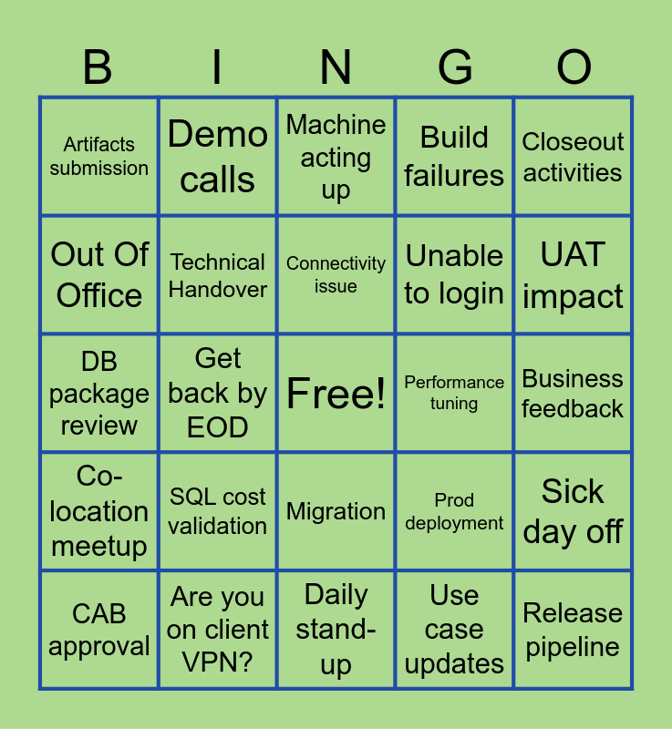 This bingo card has a free space and 75 words: Can you hear me?, Wrong window, Machine acting up, Screen froze, You are on mute, Be right back, On client call, Dropping off for another call, Last minute request, Dev plan, Revisit timelines, Code revamp, Connectivity issue, Out Of Office, Need to step away, Get back by EOD, Client escalation, Release pipeline, Trackwise updates, Closeout activities, Day0 activities, DB package review, Technical Handover, Demo calls, Build failures, Compilation errors, GitHub support, CQ is down, Joining in 5 mins, Needed on call?, You are free to drop, Resource planning, Design walkthrough, Prod deployment, UAT impact, Unable to login, Prod Fire, M&O Unique issues, Business feedback, Use case updates, Away from keyboard, Meeting conflict, Merge conflicts, Modified files, Mock deployment, Regression testing, CAB approval, Artifacts submission, Code stream lock, Pub file deployment, Rules deployment, Migration, Environment refresh, Power BI, ControlM Schedule, Go/No-Go decision, Go-live date, Let's connect offline, Weekend support, Post-prod monitoring, SQL cost validation, Veracode scan, SpotBugs, WS issues, Long running queries, Performance tuning, AppD logs, Early logoff, New SLAs, Sick day off, Co-location meetup, Are you on client VPN?, Call me on Teams, Daily stand-up and Any updates?.